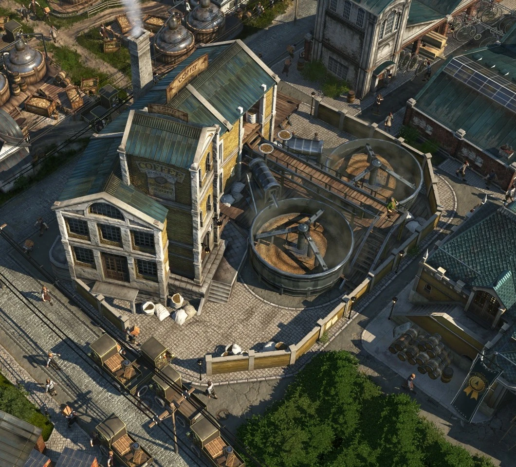 However, the Advanced Coffee Roaster provides massive simplification of logistics. Being able to be placed in the Old World removes the need to ship its product across zones, and thus the time lag inherent to shipping; in many cases, the product can ship straight out of the building to the population that demands it. The Advanced Coffee Roaster is also more space-effective on the whole; the Grain Farms and Malthouse combine for a fractionally smaller footprint than their Coffee Plantation counterparts, and can also be built on Old World islands which are typically larger and more forgiving on space than those in the New World. Grain fertility is also typically more common than Coffee, and in less competition with other fertilities compared to the New World islands.