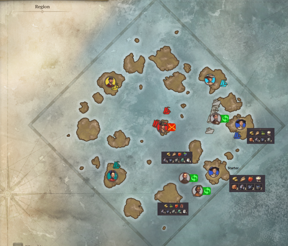 Player starts on east side of the map. Starter island has potatoes, grain, red peppers, and nitre. All neutral traders are close by with pirates in the center.