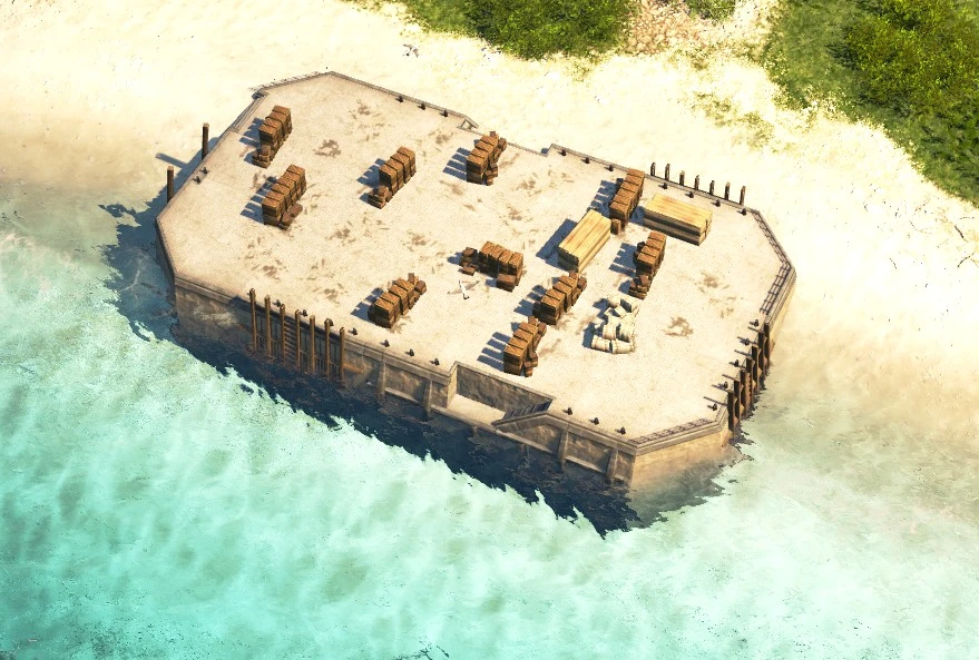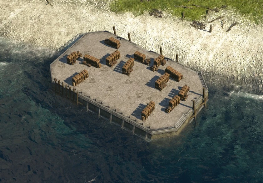 Quays can be built a bit similarly to roads and ornaments - a big harbour area can be covered with quay by left-clicking on one tile and then dragging over an area. Longer lines of quays which are at least two tiles wide can have some crates and boxes on top of them. Quays have no other purpose other than making harbours look aesthetically pleasing, although unlike ornaments the quays do not increase the island's attractiveness. One way of using quays is for example filling empty spaces in between other harbour buildings, since harbour buildings look as if they were constructed on top of a quay. However, connecting buildings via quays has no impact on the gameplay and the functionality of those buildings. When it comes to connecting harbour buildings to the