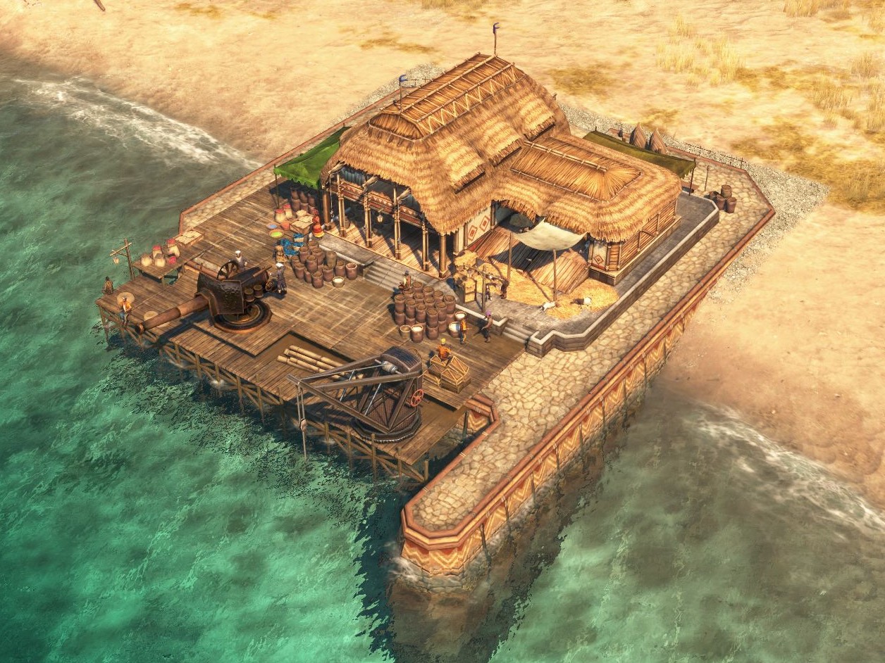Trading Post is the most crucial Infrastructure and Harbour building in the game, it grants the ownership of the island it is built on. It provides space for storing goods and acts as a Warehouse by having several loading ramps which can be used by buildings' carts to load and unload goods. It also allows to transfer goods and items between ships and the island. Only one trading post can be built on an island.